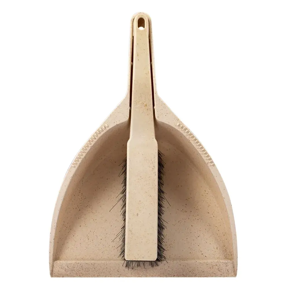 Практические детали: совок трапециевидной формы, размеры приблизительно 25x20 см, ручка щетки с отверстием для подвешивания, щетина черная, поверхность матовая, цвет бежевый с крапинами.