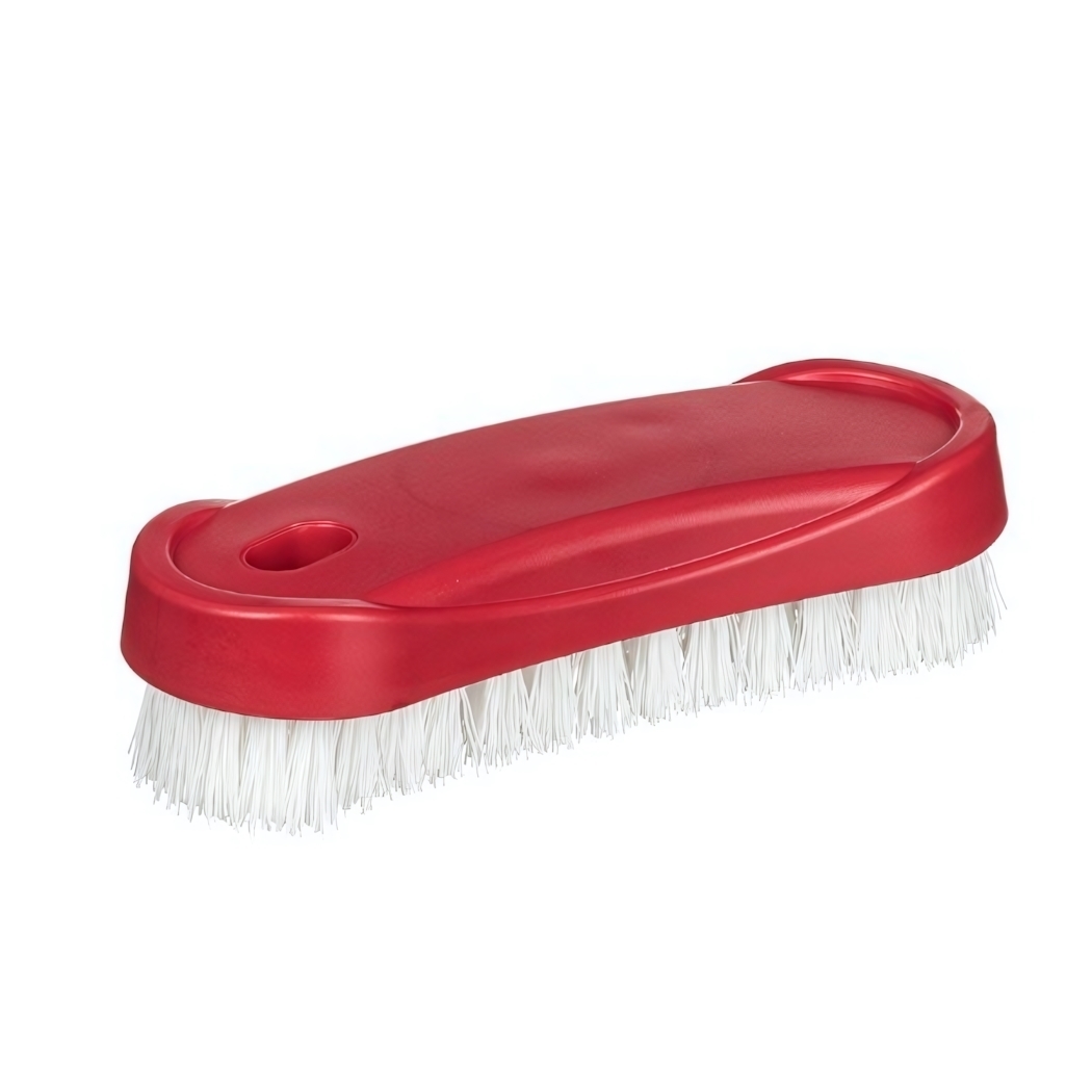 Красный пластиковый корпус с белыми нейлоновыми щетинками создан для долговечности. Специальное отверстие позволяет хранить щетку в подвешенном состоянии, экономя место. Утолщенная ручка с противоскользящими насечками гарантирует безопасность во время использования.