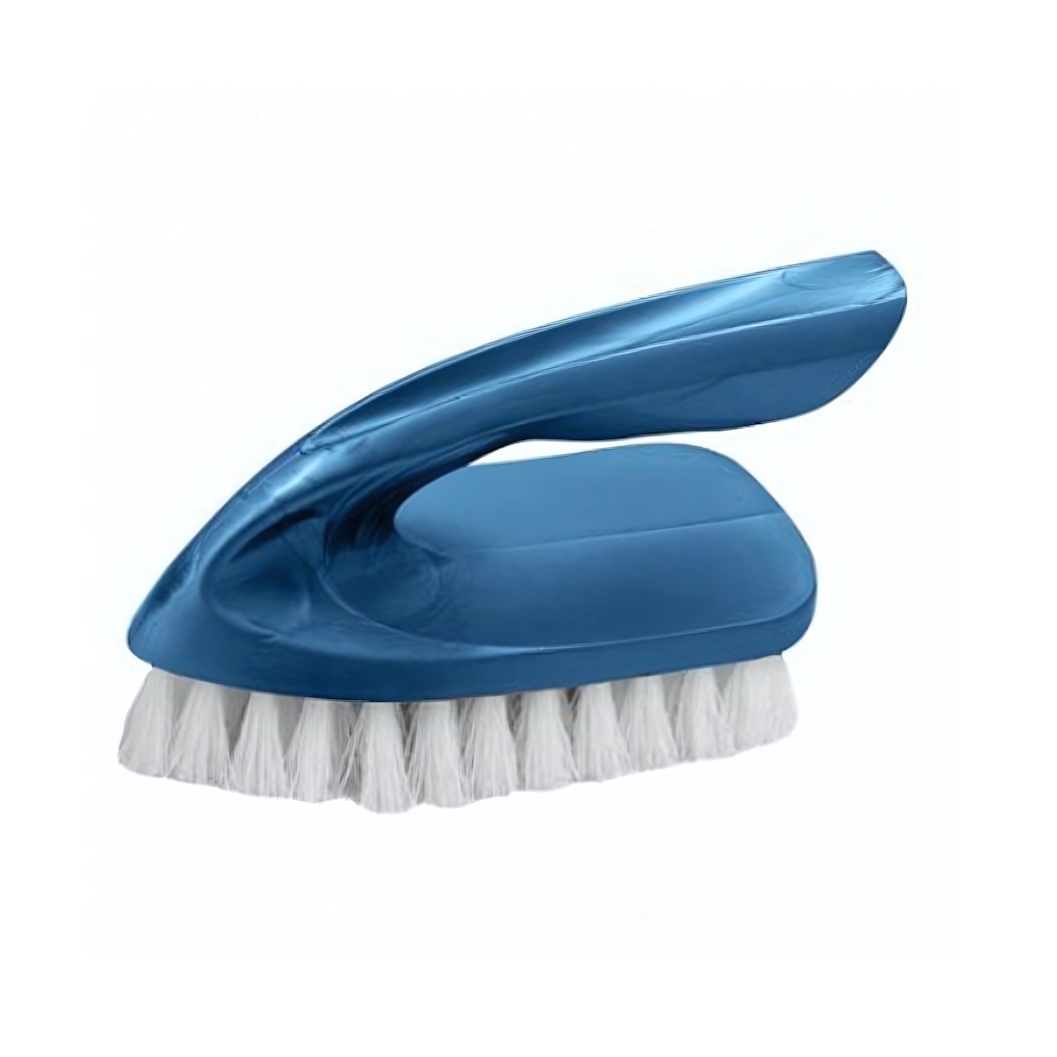 Корпус выполнен из прочного пластика в цвете индиго, щетина — плотная, белого цвета, собрана в пучки и равномерно распределена по рабочей поверхности. Конструкция обеспечивает надежное соединение ручки и основания, что повышает устойчивость к нагрузкам. Щетка не требует сложного ухода и легко промывается после использования.