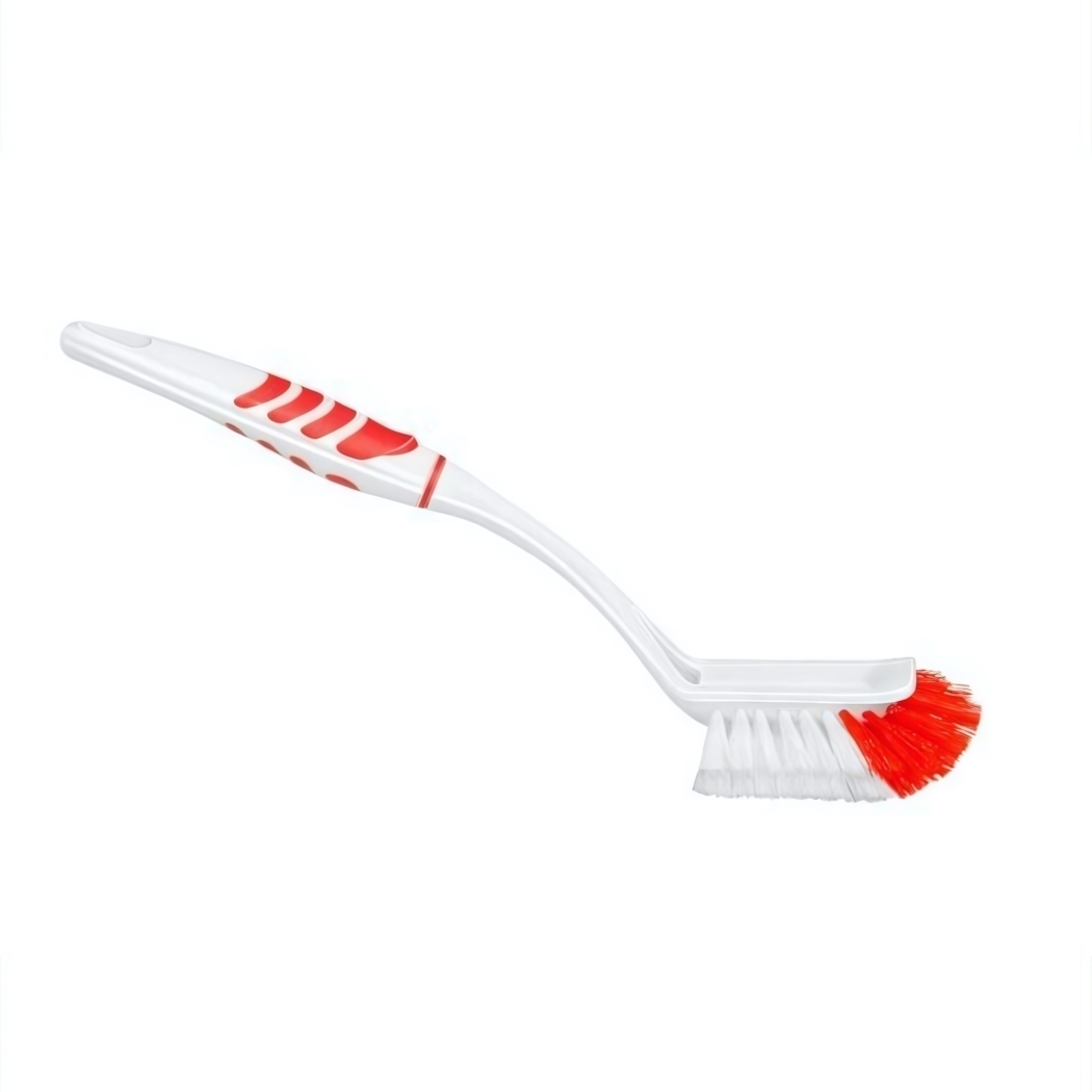 Щётка для посуды с изогнутой ручкой и двухсторонней щетиной создана для комфортного мытья даже в труднодоступных местах. Мягкая белая щетина бережно очищает поверхности, а жёсткие красные ворсинки справляются с засохшими загрязнениями.