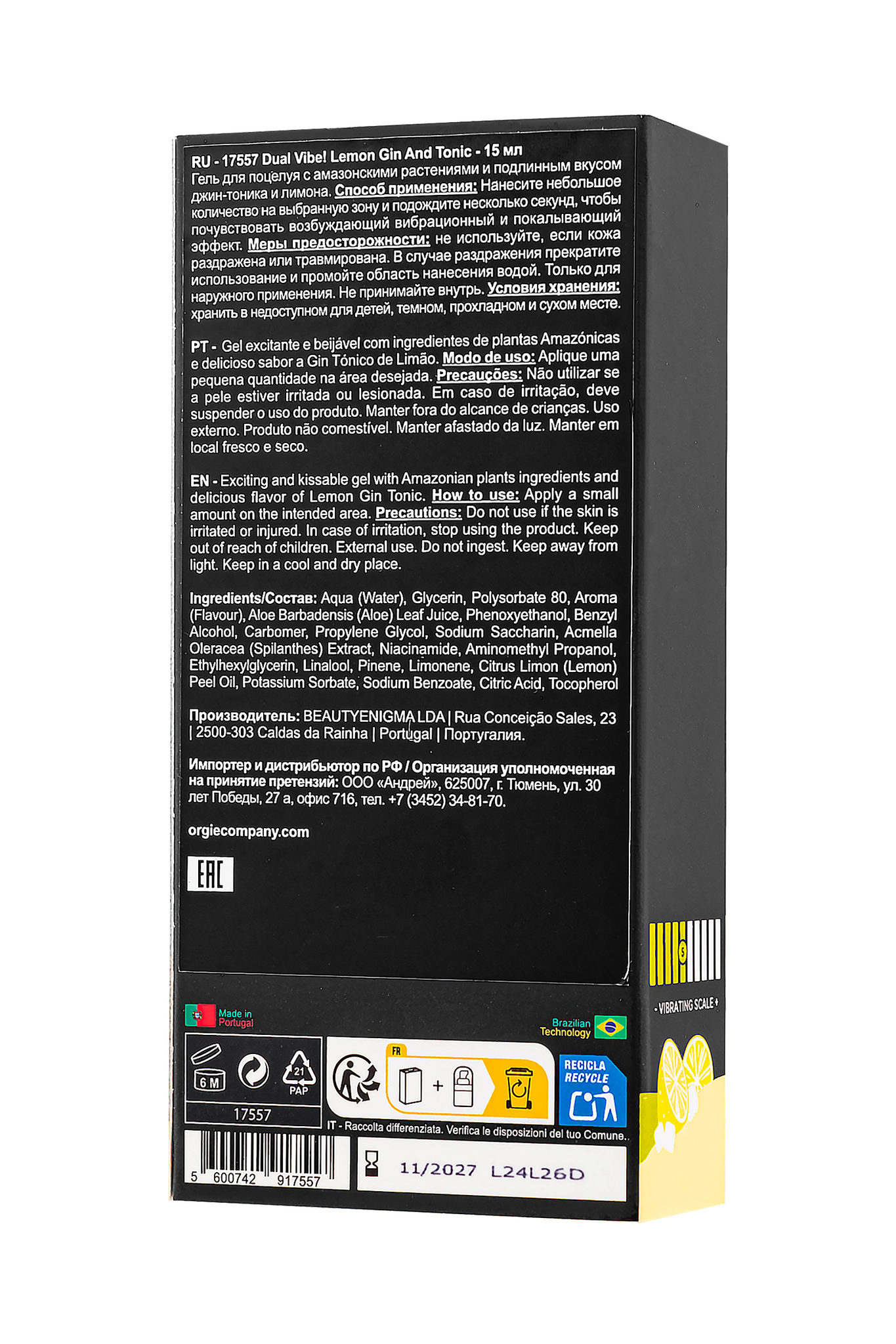 Этот съедобный гель объемом 15 мл создан для тех, кто хочет добавить яркости и удовольствия в интимные моменты. Его насыщенный аромат джин-тоник и лимона создает особое настроение и привлекательность.
