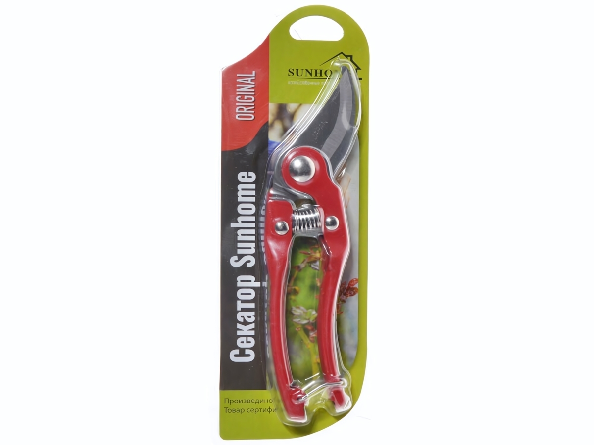 Длина инструмента – 21 см, материал лезвий – металл, ручки выполнены в красном цвете с зелёно-жёлтым рисунком. Цвет ручек в ассортименте, отгружается один товар, цвет определяется случайным образом. Компактный размер секатора позволяет хранить его в ящике с инструментами или подвешивать на стену.