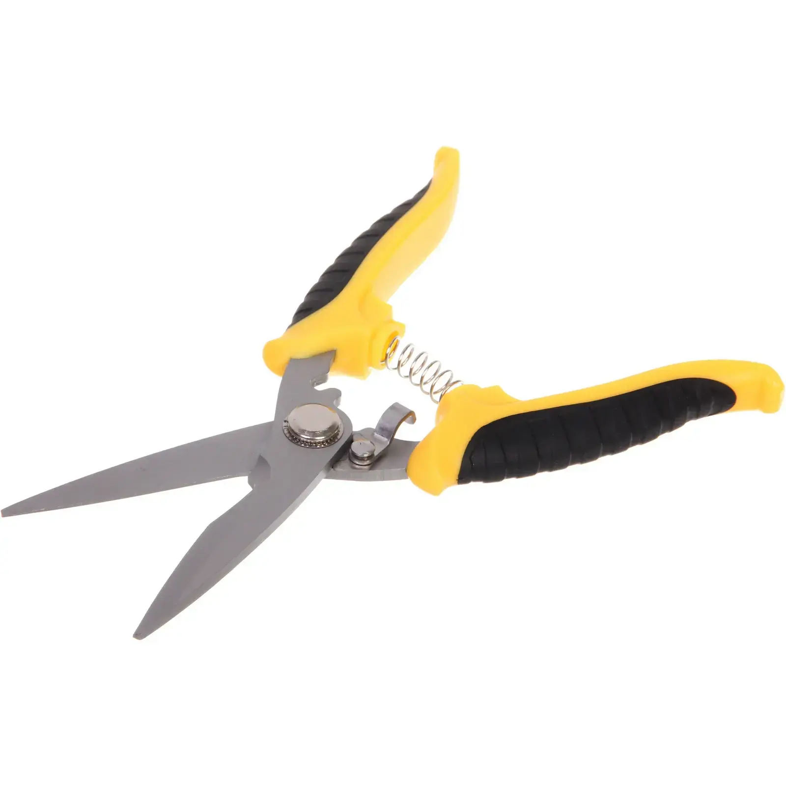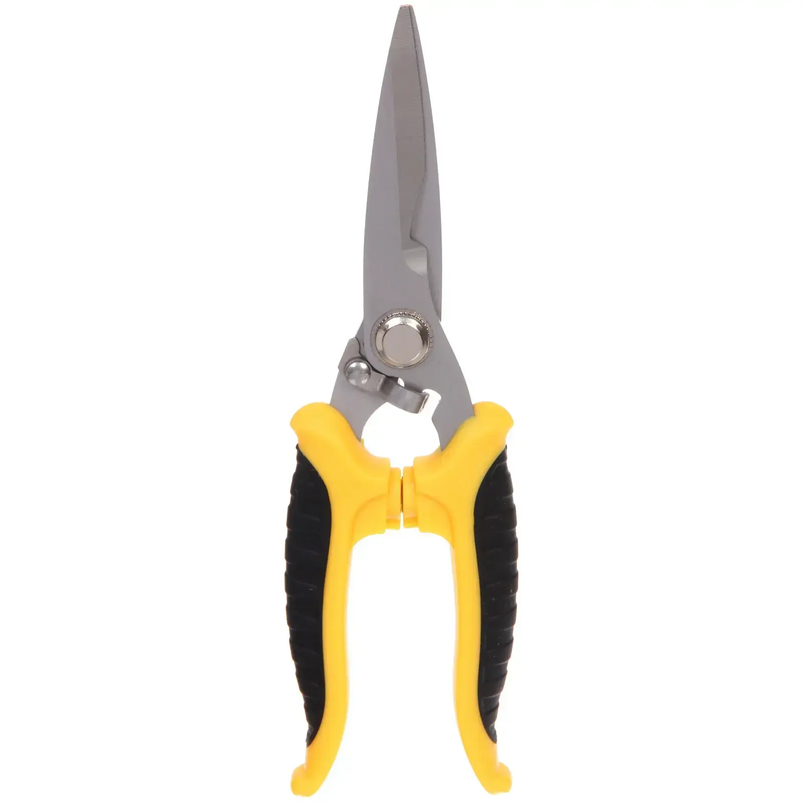 Ножницы изготовлены из качественных материалов: металлические лезвия обеспечивают долговечность, а пластиковые ручки с резиновыми вставками гарантируют комфортную работу. Общая длина инструмента составляет 20см, что делает его удобным для хранения и транспортировки.