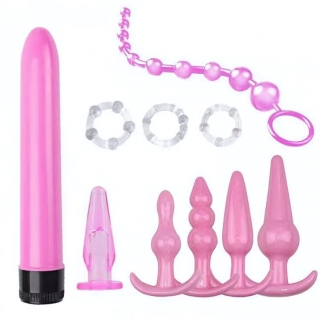 Вибратор, 4 пробки, 1 насадка, 3 эрекционных кольца, 1 анальные бусы.