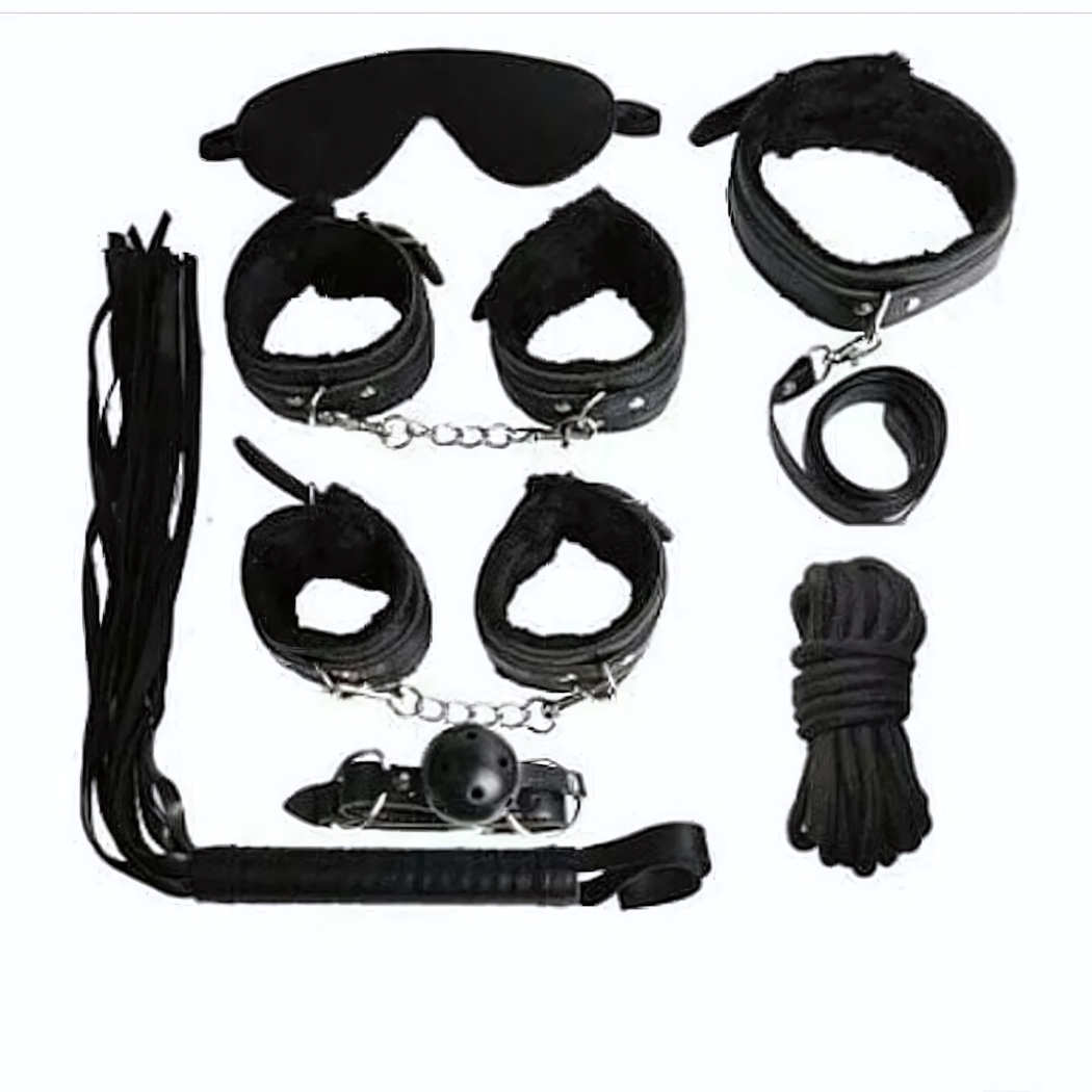 дышащий кляп, ошейник, поводок, веревка, маска на глаза, оковы, плеть, поножи.