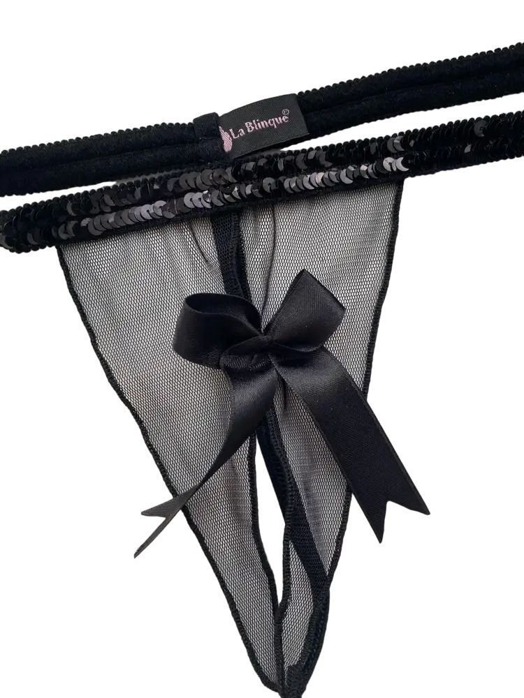 Трусики-стринги с пайетками и бантом, черные, размер S-M, сексуальный дизайн