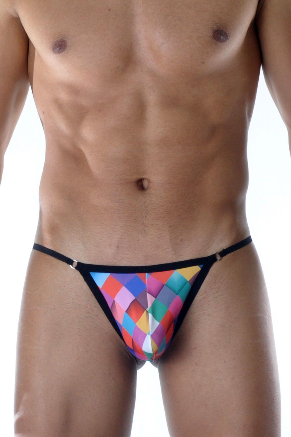 Эти мужские трусы-стринги сочетают смелый дизайн и комфортную посадку. Яркий квадратный принт создаёт выразительный акцент, а эластичная ткань мягко облегает тело, сохраняя свободу движений.