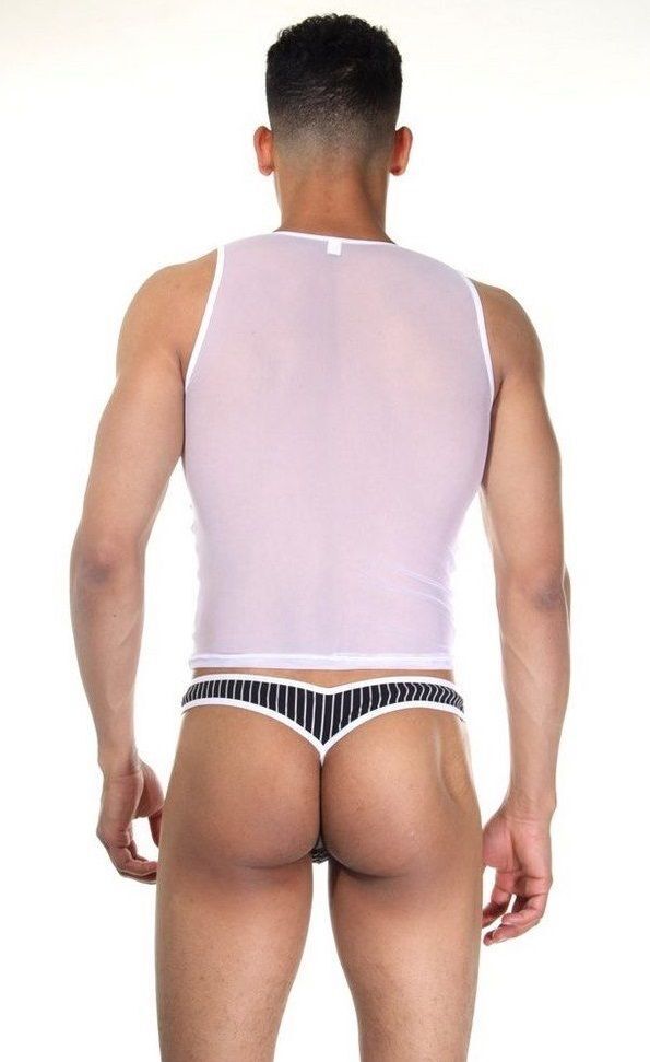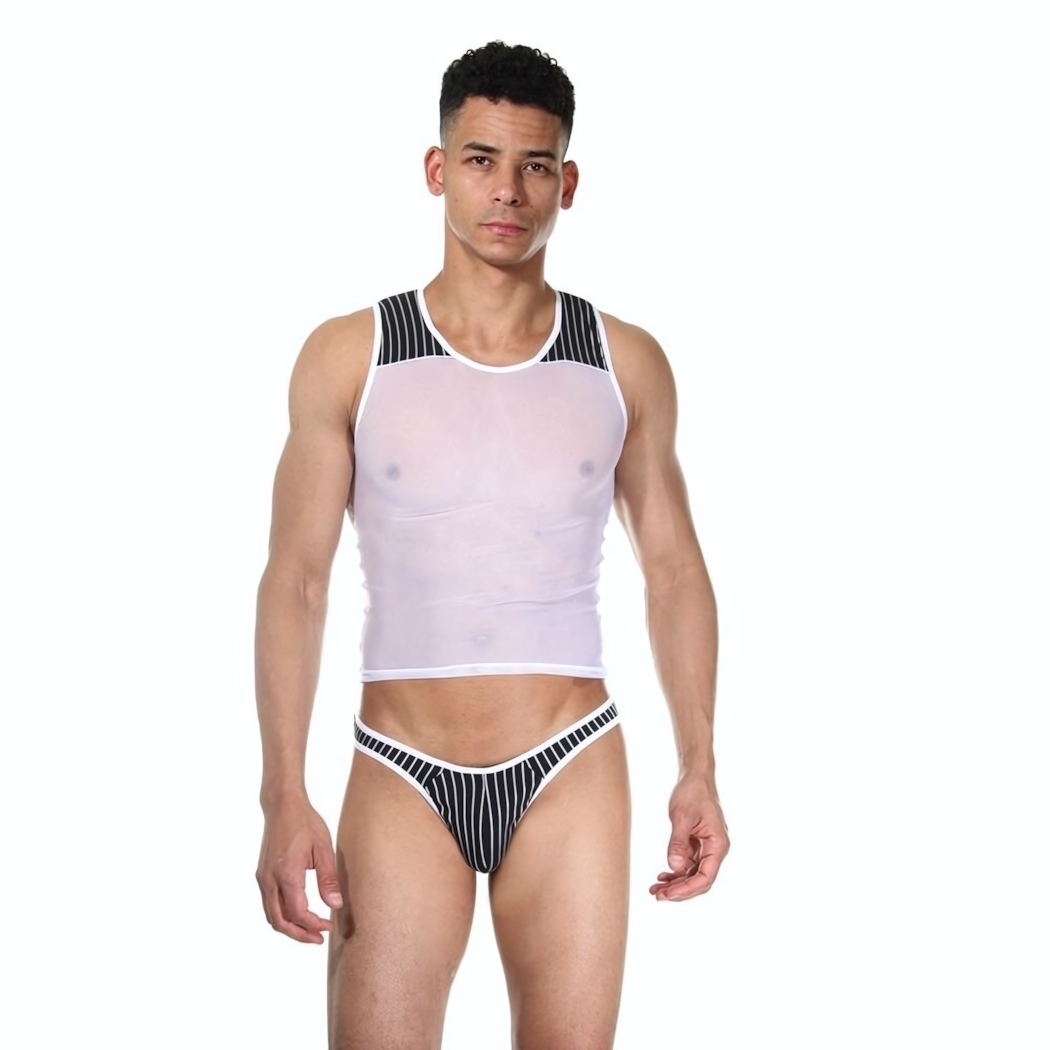 Мужской комплект белья с эротичным дизайном: майка и стринги, размер L-XL, белый/черный, 85% полиамид, 15% эластан