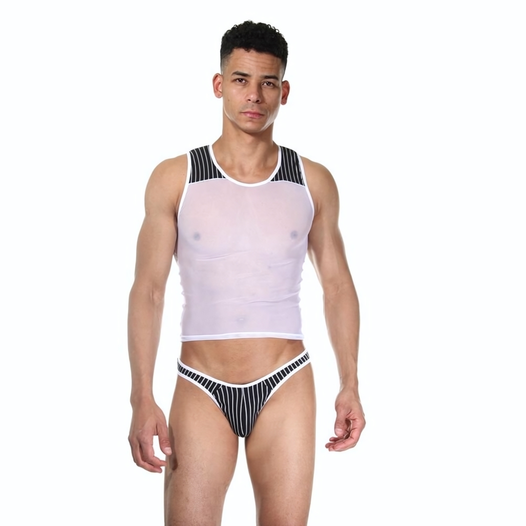 Комплект разработан с учетом анатомических особенностей мужской фигуры: майка с усиленной посадкой на плечах, стринги с эргономичным кроем. Подходит для повседневной носки или специальных мероприятий.