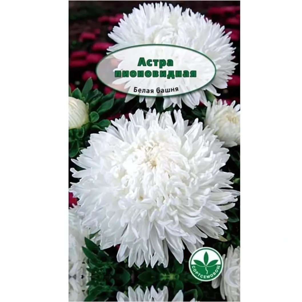 Упаковка содержит 0,3 г семян пионовидной астры "Белая башня".