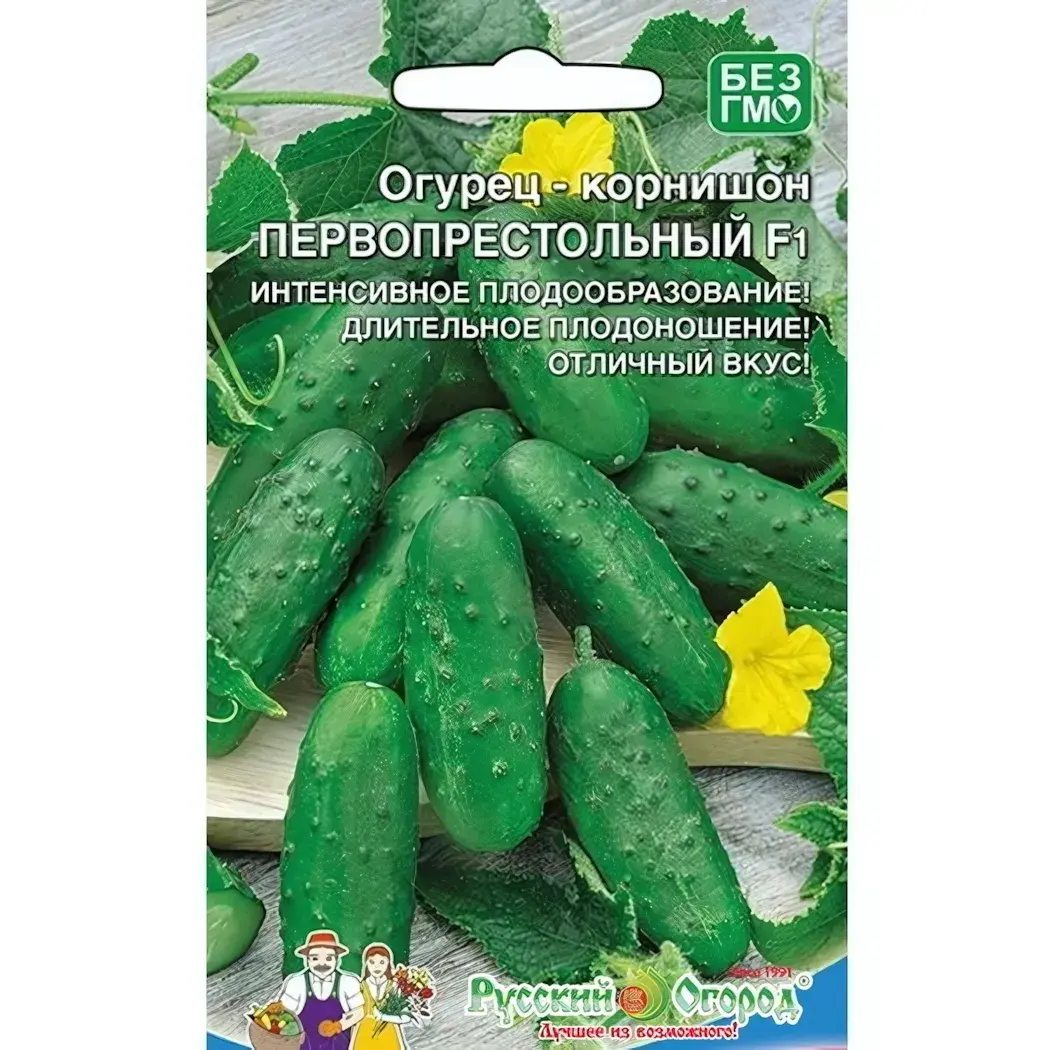 Семена упакованы в удобный пакетик, который защищает их от внешних воздействий. Упаковка содержит информацию о характеристиках сорта, включая отметку 'БЕЗ ГМО', что гарантирует безопасность и натуральность продукта. Выращивайте огурцы 'Первопрестольный F1' и наслаждайтесь их отличным вкусом и качеством!