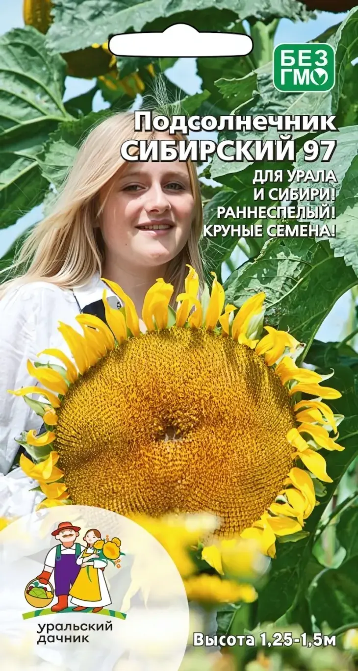 Семена упакованы в яркую упаковку с изображением подсолнечника и информацией о предназначении: 'Для Урала и Сибири! Раннеспелый! Крупные семена!'. Высота растения составляет 1,25-1,5 м, что делает его подходящим для различных садовых композиций. Выбирайте 'Сибирский 97' и наслаждайтесь богатым урожаем!