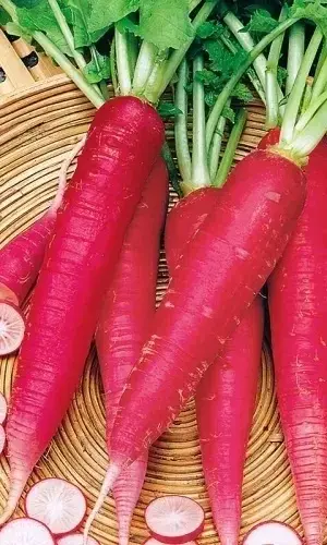- Крупные и сочные корнеплоды: Удлиненно-цилиндрическая форма, длиной до 20 см и массой до 100 г, с ярко-красной кожурой и нежной белой мякотью.