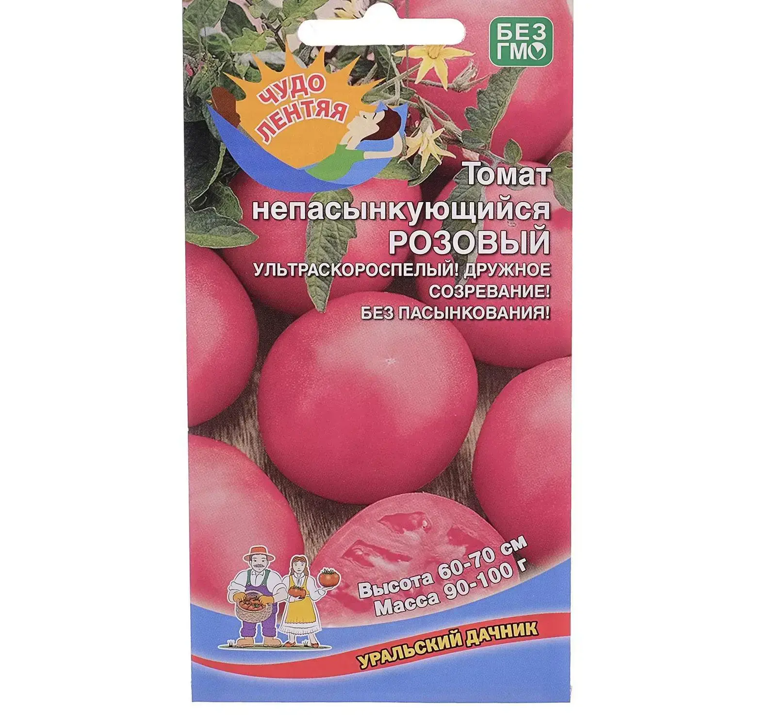 Упаковка семян оформлена в ярком дизайне с изображением спелых томатов, что делает её привлекательной для покупателей. На упаковке указаны все необходимые характеристики, включая высоту растений и массу плодов. Выращивайте 'Непасынкующийся Розовый' и наслаждайтесь вкусом свежих томатов прямо с вашего огорода!