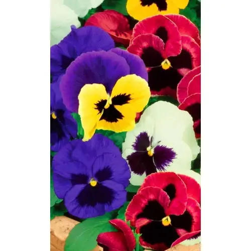 - Богатая палитра: Смесь включает цветы в фиолетовых, жёлтых, красно-чёрных, бело-бордовых и других сочетаниях, часто с контрастным "глазком".