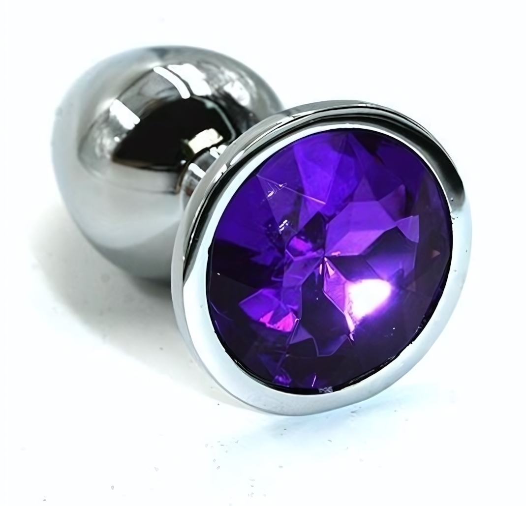 Анальная пробка из алюминия с фиолетовым кристаллом, 6 см, диаметр 2.8 см, вельветовый мешочек