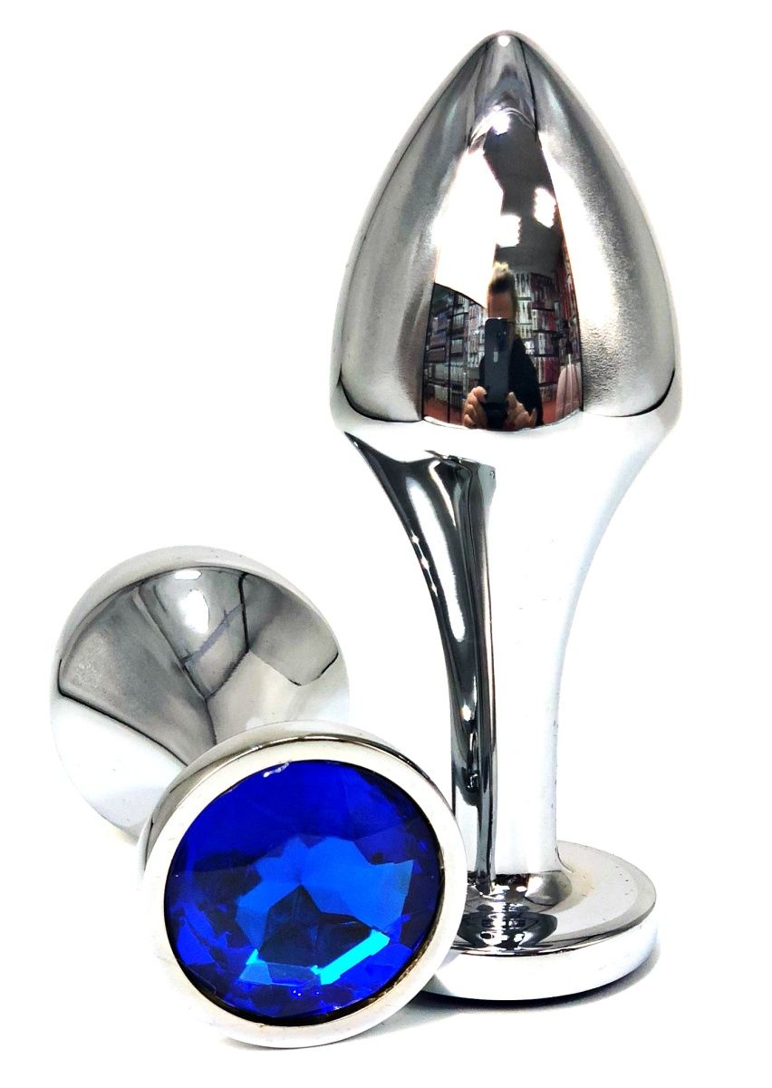 Анальная пробка металлическая с синим кристаллом, серебристая, 9 см, для комфортного ношения