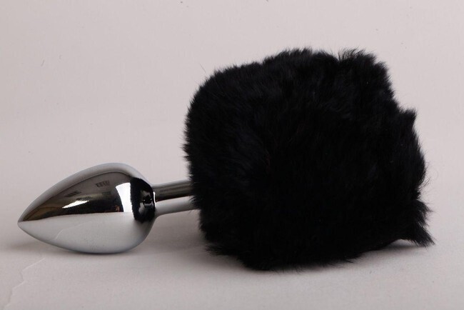 Анальная пробка с меховым хвостиком, металл, серебристо-черная, длина 6 см, диаметр 2.7 см