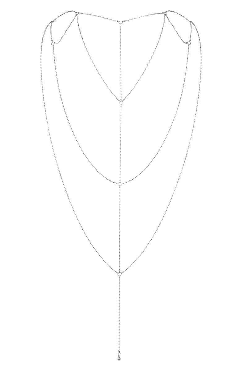 Цвет: серебристый; Материал: металл. Цепочка имеет V-образный контур, который элегантно обрамляет тело, создавая эффектный вид. Она станет отличным подарком для любой женщины, которая ценит стиль и оригинальность. Упакована в дизайнерскую упаковку, что делает её идеальным вариантом для подарка.