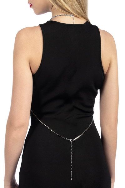 Украшение состоит из системы тонких серебристых цепочек, которые образуют изящные контуры на теле. Передняя часть создаёт каскадные дуги, спускающиеся от плеч к талии, а задняя часть дополнена элегантными элементами на шее и спине. Такая конструкция обеспечивает комфортное прилегание и повторяет естественные изгибы фигуры.
