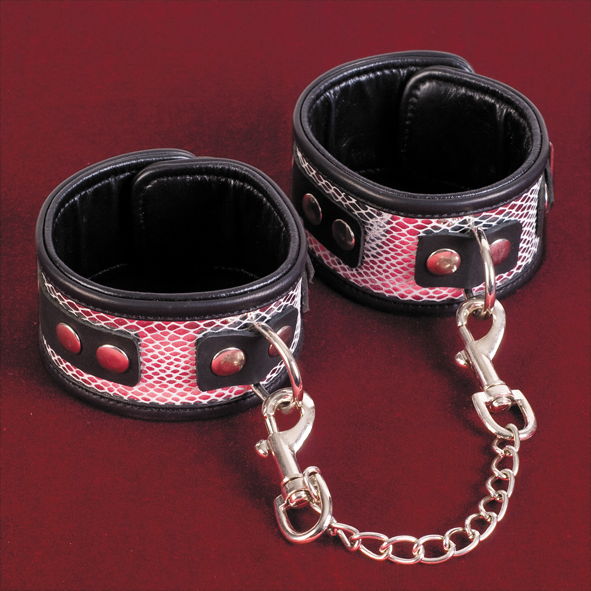 - Конструкция: Каждая манжета оснащена металлическими элементами и кольцом для крепления. В комплект входит металлическая цепочка из овальных звеньев, которая соединяет обе манжеты, и два надёжных карабина серебристого цвета с подпружиненными защёлками для быстрого и безопасного соединения.