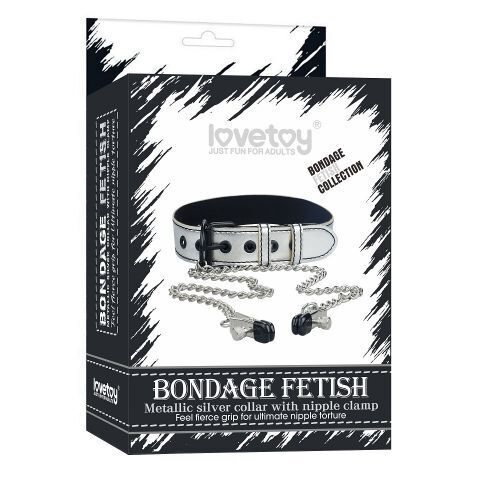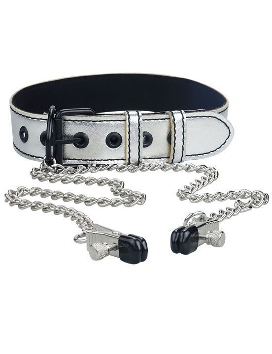 Серебристый ошейник с зажимами для сосков