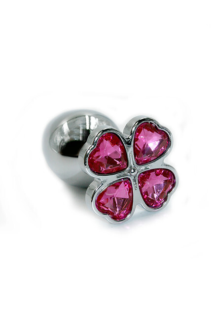 Анальная пробка металлическая, серебряная с розовыми кристаллами, длина 6см, диаметр 2,6см
