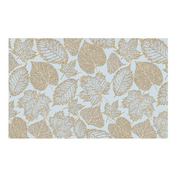 Нежный светло-голубой фон с объёмным узором из листьев добавляет текстуру и глубину композиции. Золотистые блики создают эффект роскоши, гармонично сочетаясь с посудой разных стилей — от классики до современного минимализма.