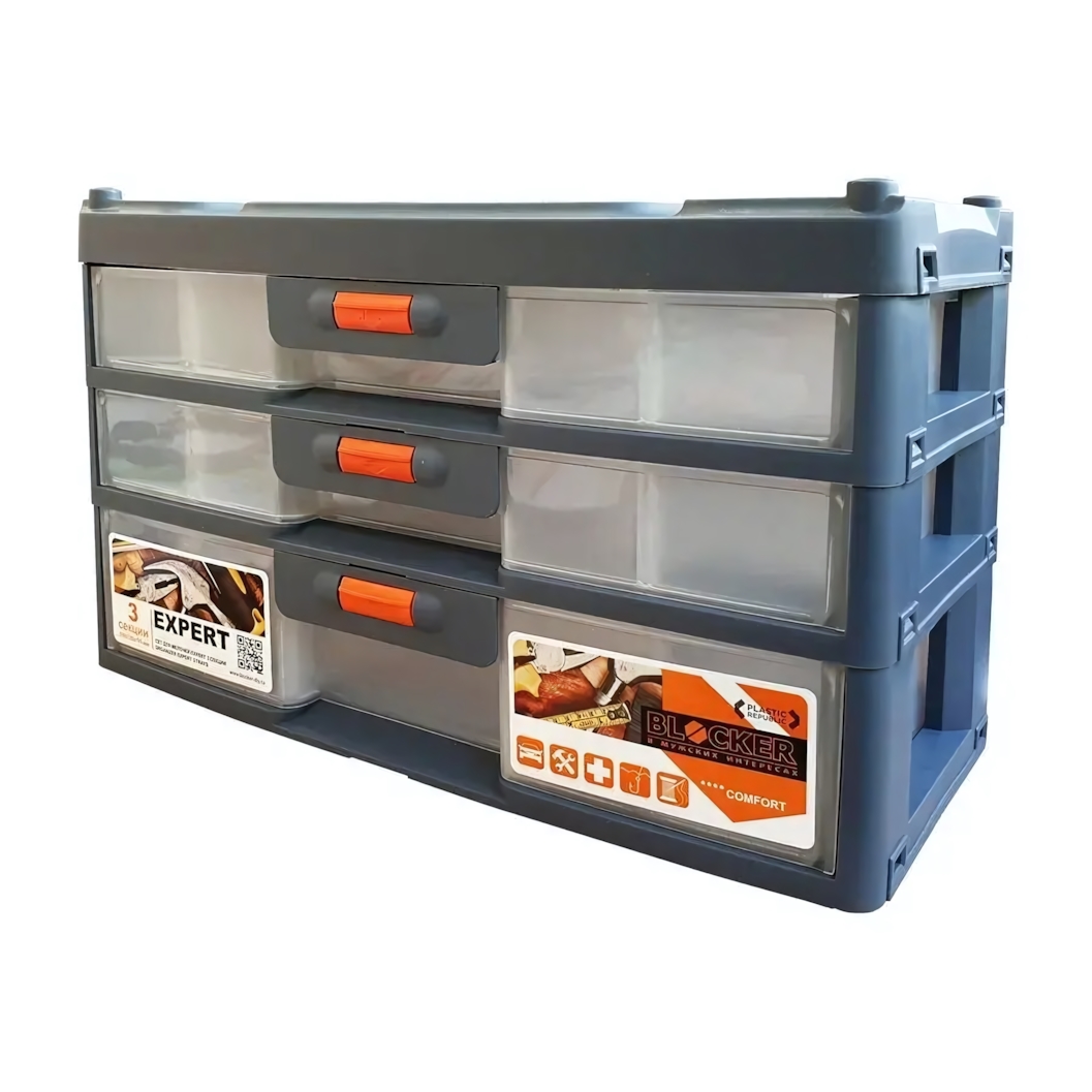 Пластиковый органайзер "EXPERT" с тремя секциями — решение для удобного хранения инструментов, бытовых принадлежностей и любых мелких предметов. Эмоциональный крючок: больше никакой путаницы и потери времени на поиск нужных вещей! Вам всегда доступен быстрый обзор содержимого благодаря прозрачным фасадам ящиков.