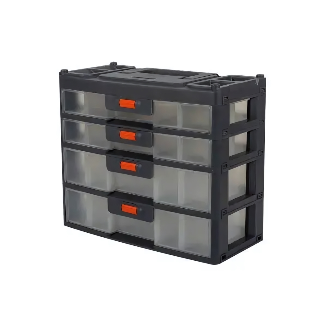 Решите проблему хранения инструментов и мелких деталей с практичным контейнером, который совмещает комфорт использования и надёжность. Четыре выдвижных секции помогают структурировать пространство и сразу видеть содержимое, а яркие оранжевые ручки обеспечивают удобство открытия даже грязными руками. Прозрачные фасады облегчают быстрый поиск нужных предметов — забудьте о хаосе на рабочем месте!