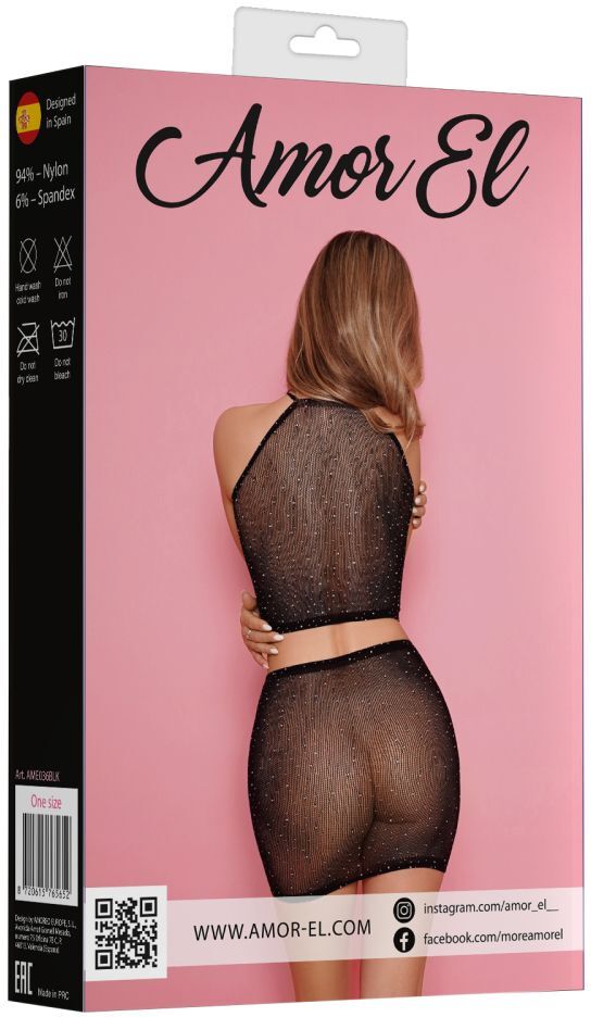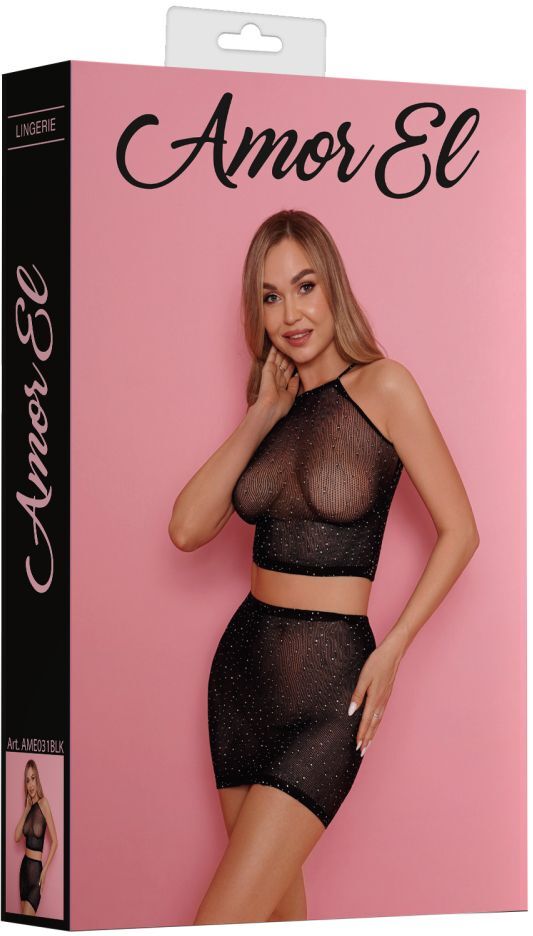 Комплект эротического белья Amor El: топ и юбка из сетки со стразами, черный, размер S-M-L