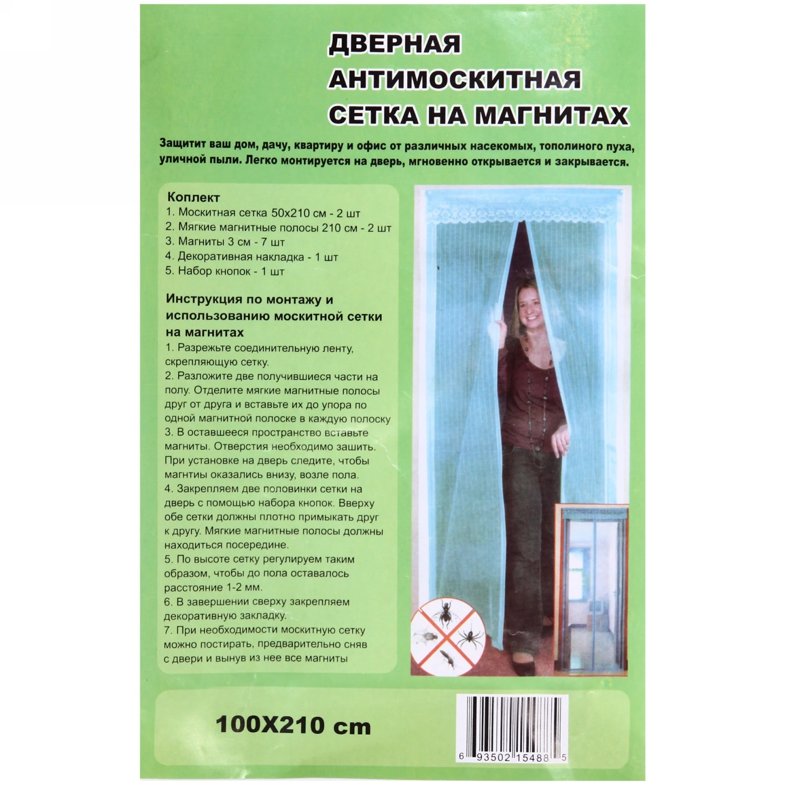 Сетка подходит для установки на любые двери, обеспечивая надежную защиту от насекомых. Просто прикрепите её к дверному проему с помощью магнитных полос, которые входят в комплект. Сетка легко открывается и закрывается, что делает её идеальной для частого прохода. Она подходит для использования в домах, квартирах, дачах и на летних верандах.