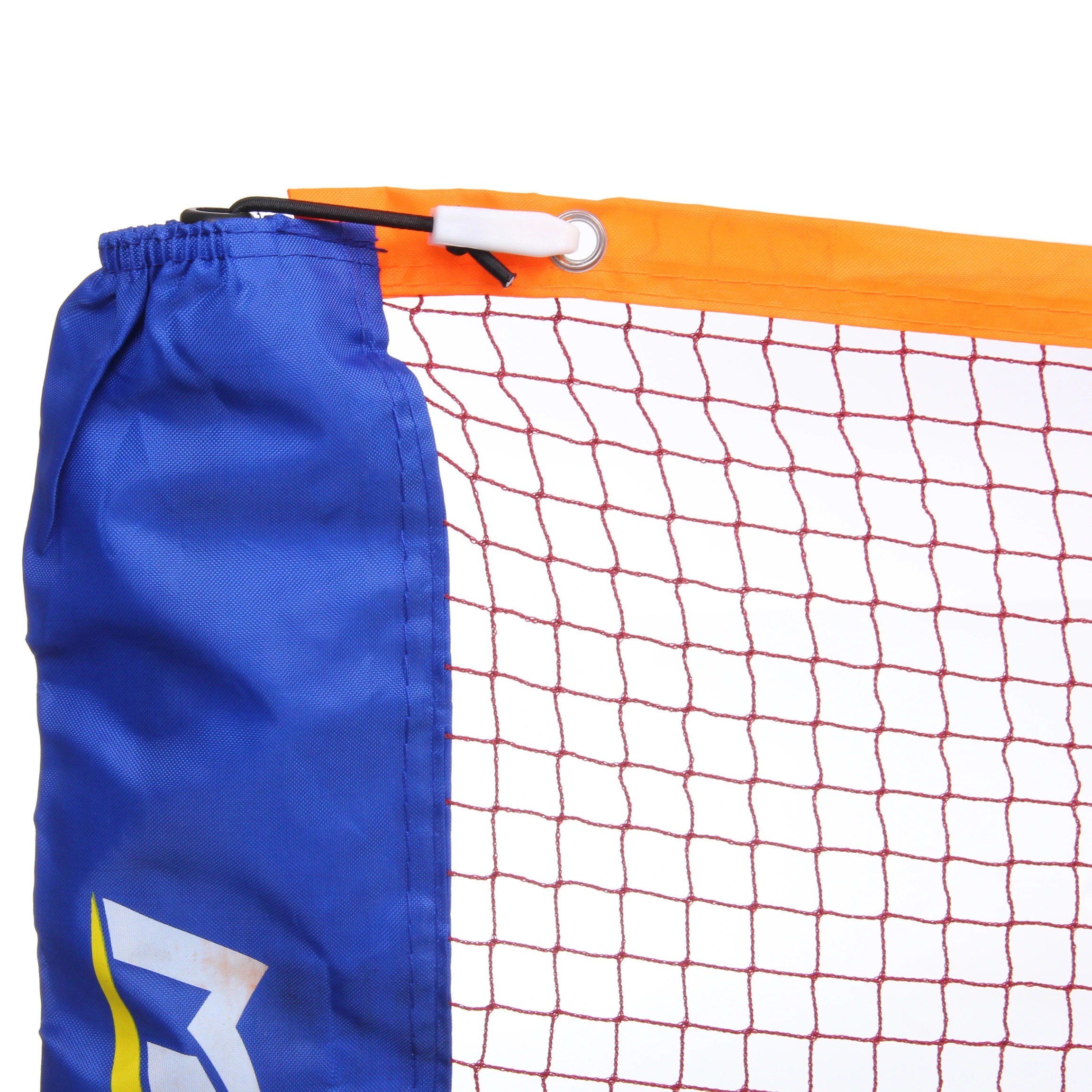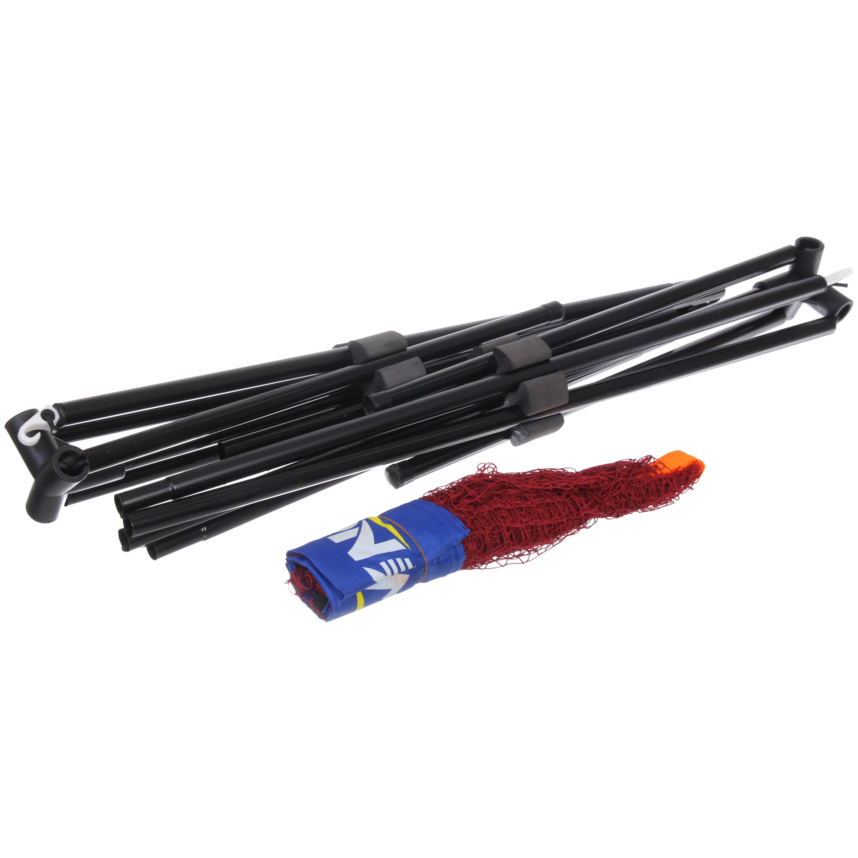 Эта сетка изготовлена из прочных материалов: металл, пластик и полиэстер, что гарантирует её долговечность и устойчивость к внешним воздействиям. Чёрный цвет с оранжевыми и синими элементами не только стильно выглядит, но и хорошо заметен на фоне зелёного газона. Сетка также легко складывается и помещается в специальный чехол для транспортировки, что делает её удобной для хранения и переноски.