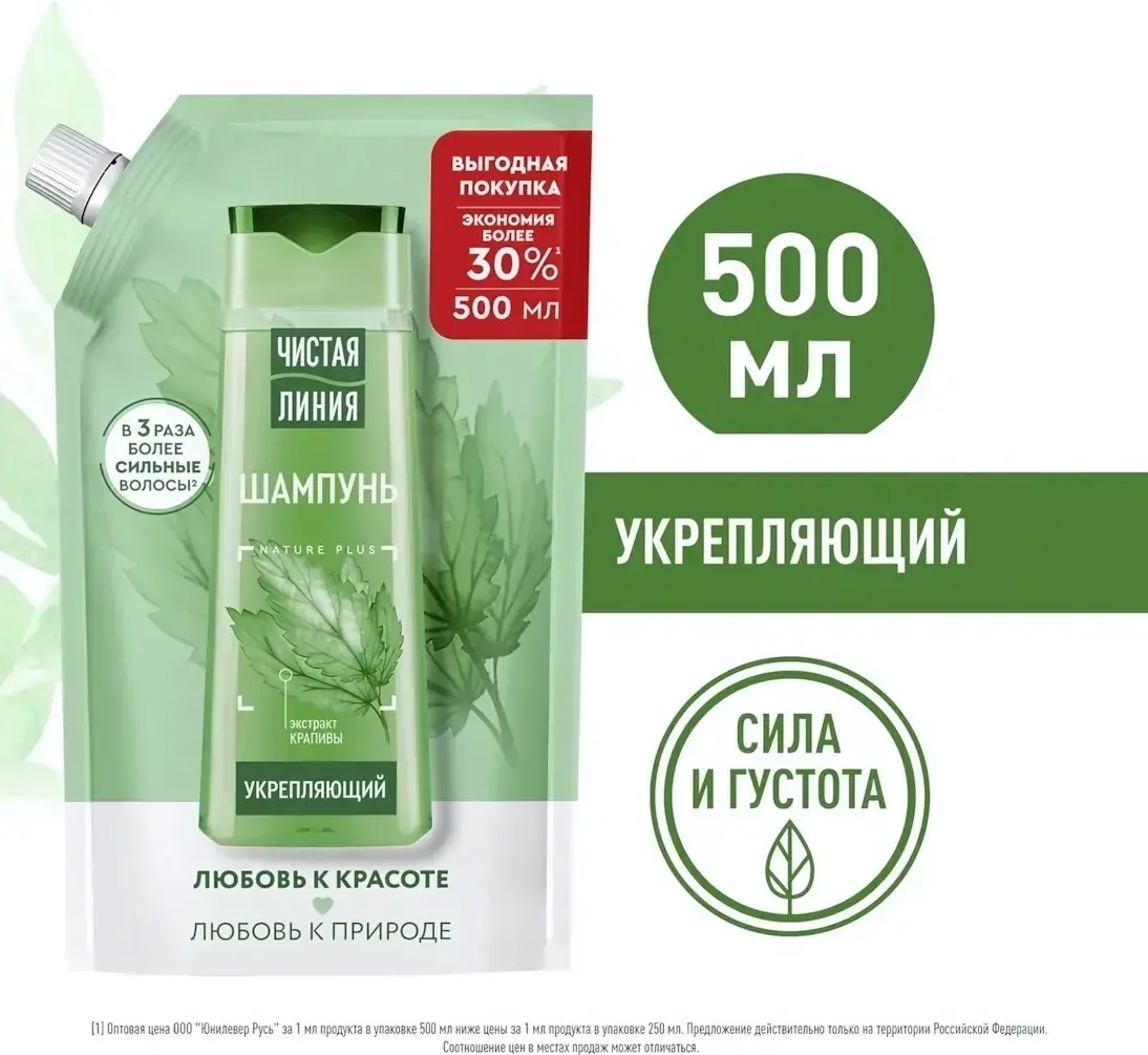 Подарите своим волосам силу и густоту с шампунем ЧИСТАЯ ЛИНИЯ, который содержит экстракт крапивы. Этот укрепляющий шампунь не только заботится о ваших волосах, но и дарит им здоровье и блеск. Упаковка объемом 500 мл в удобном дой-паке позволяет легко использовать продукт и экономить пространство в ванной.