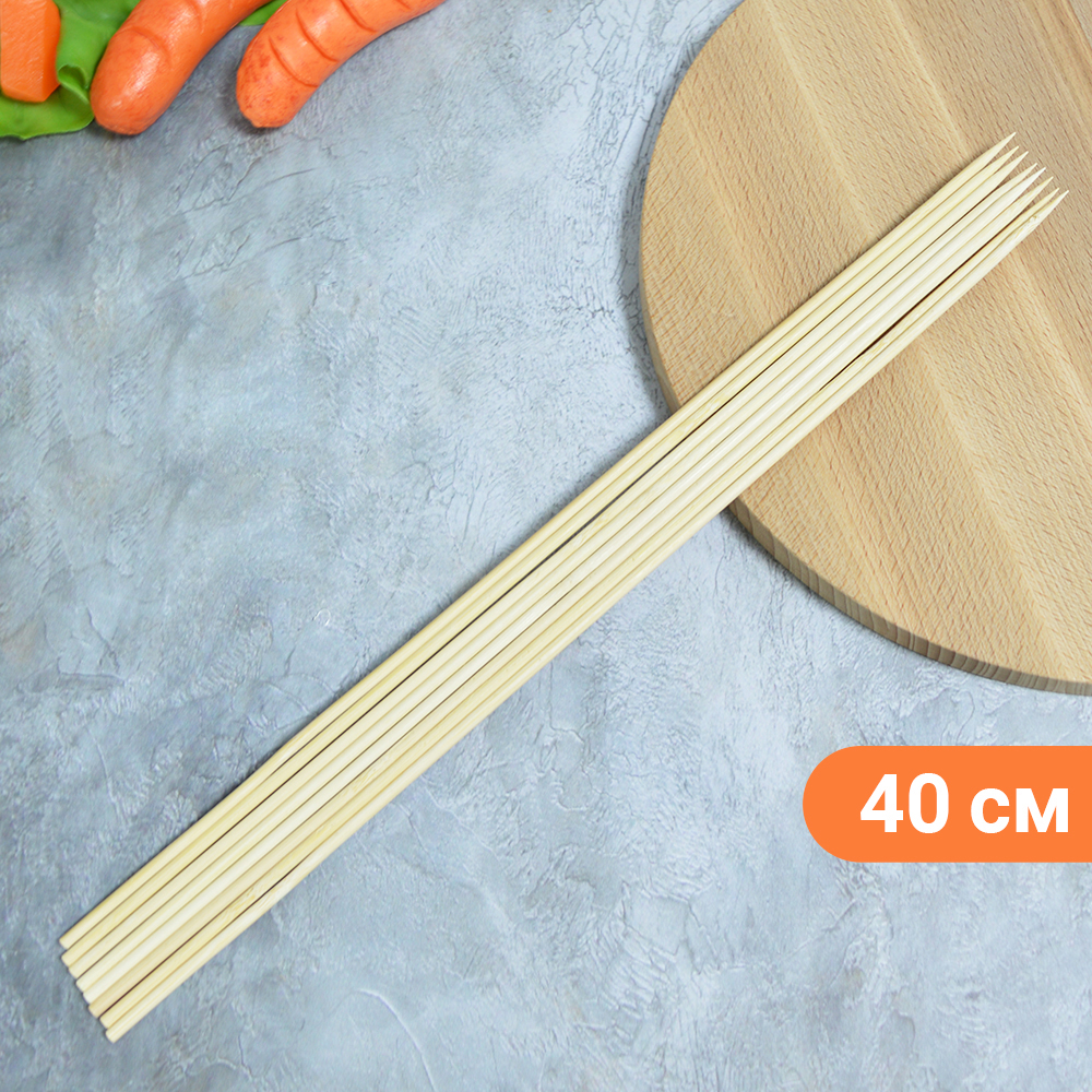 Шампуры бамбуковые 40см*4мм предназначены для приготовления мини-шашлычков из мяса, птицы, рыбы, овощей, а также для создания канапе. Длина - 40 см. В упаковке 50 шт.