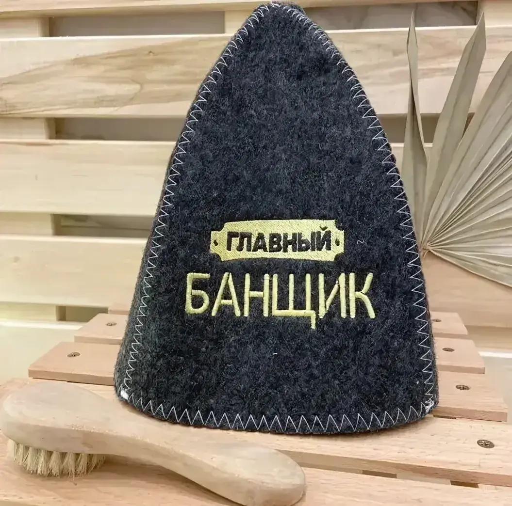 Натуральная шерсть с полиэстером создаёт надёжный барьер от перегрева, продлевая удовольствие от банных процедур. Стильная золотая вышивка «Главный банщик» добавляет индивидуальности и делает шапку идеальным подарком для ценителей традиционной бани.