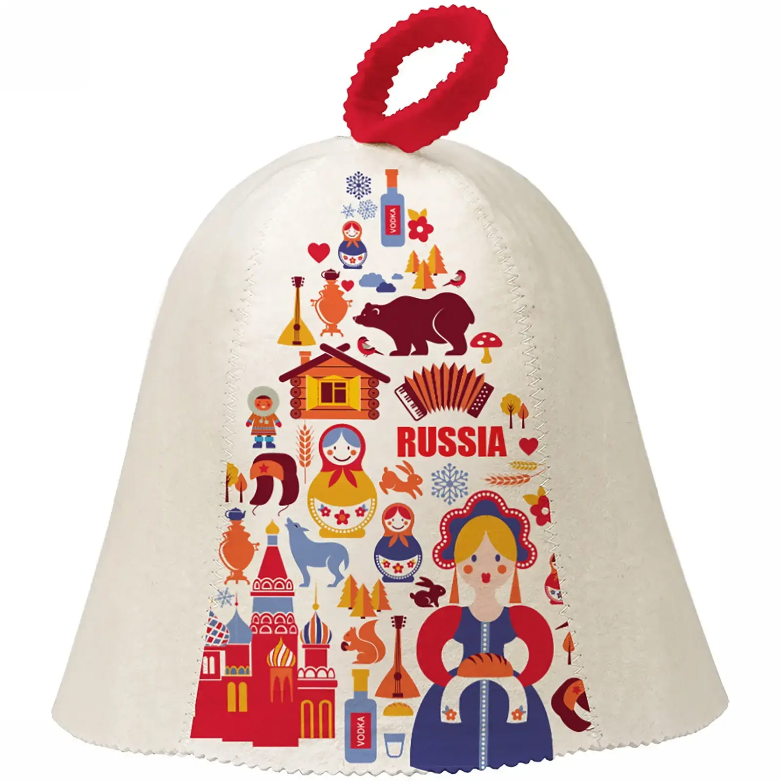 Эта шапка станет вашим незаменимым спутником в бане, обеспечивая комфорт и защиту от теплового удара. Изготовленная из высококачественного войлока, она почти не нагревается, что позволяет вам наслаждаться паром дольше. Яркий принт с изображением матрешек и других символов русской культуры добавляет стильный акцент, делая шапку отличным подарком для любителей бани.
