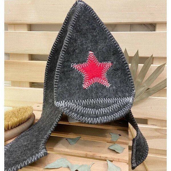 Шапка изготовлена из качественного фетра серого цвета с декоративной красной звездой и контрастной строчкой. Идеально подходит для домашних бань и саун.