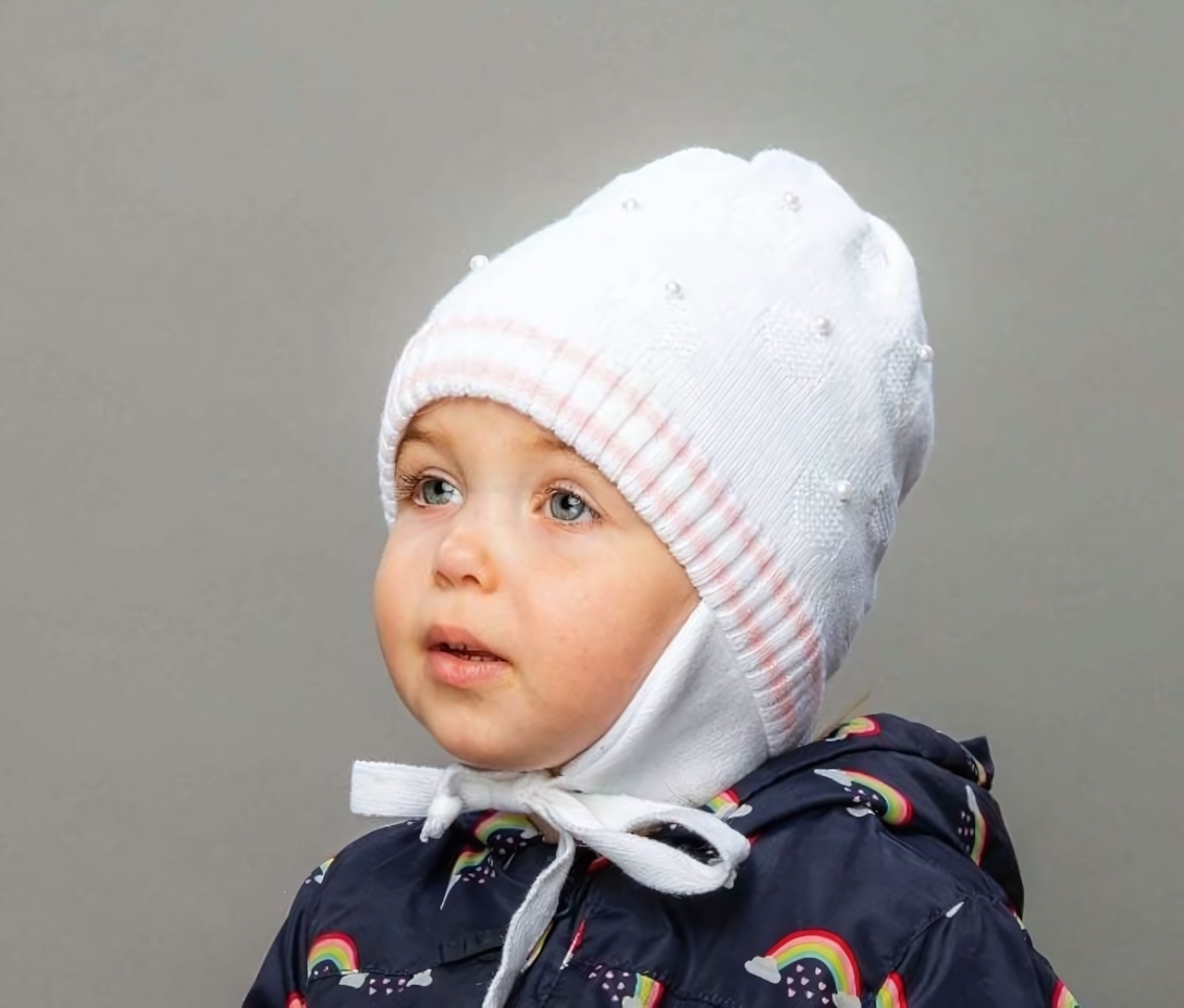 - Стильный дизайн: Шапка представлена в нежных цветах (розовый с белым), что делает ее привлекательной и модной.