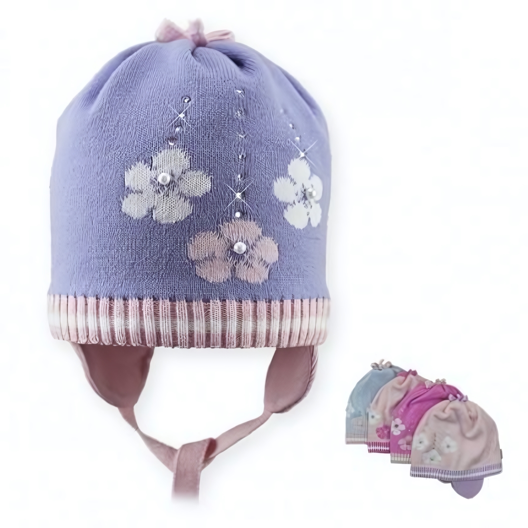 Шапка рассчитана на демисезонное использование — отлично подойдет для прохладных весенних и осенних дней. Завязки надежно фиксируют шапку на голове, не позволяя ей сползать во время активных игр. Верх модели украшен небольшим бантиком, придающим ей изюминку, а оригинальный дизайн с цветочными аппликациями и стразами делает образ нарядным. Отгружается один товар, цвет определяется случайным образом.