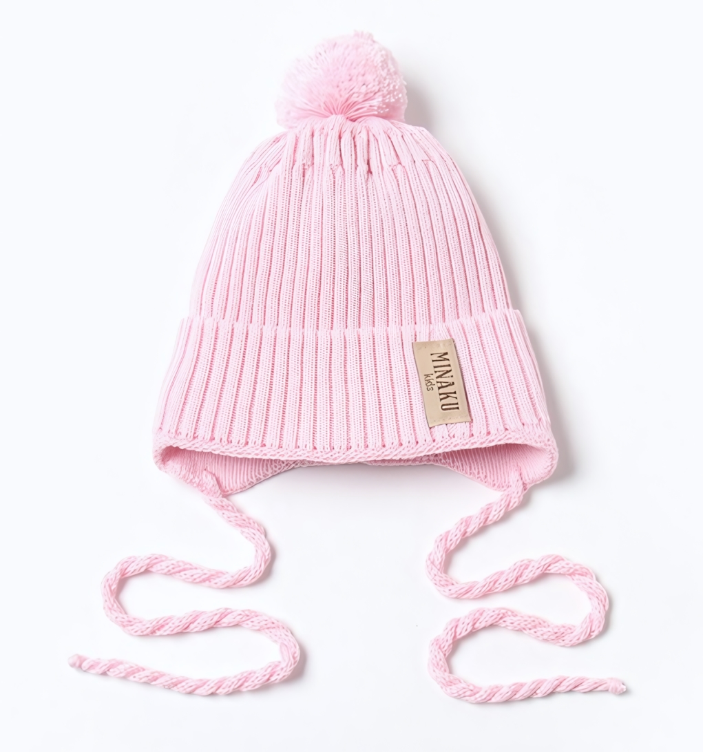 Шапка детская вязаная с помпоном и завязками, акрил/хлопок, р.46, цвет светло-розовый