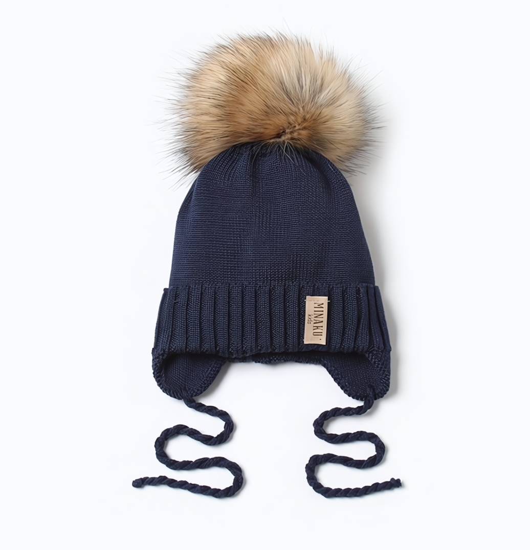 Темно-синий цвет не только универсален, но и менее маркий, что важно для детской одежды. Помпон с градиентом от светло-бежевого к тёмно-коричневому добавляет выразительности, при этом оставаясь ненавязчивым элементом.