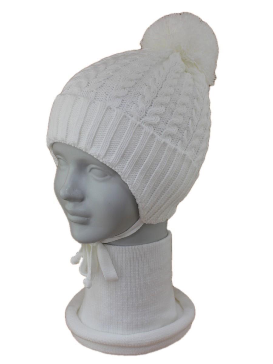Шапка детская «VALYA BAW-H» двойная с помпоном, белая, хлопок/акрил, завязки, р-р 52-54