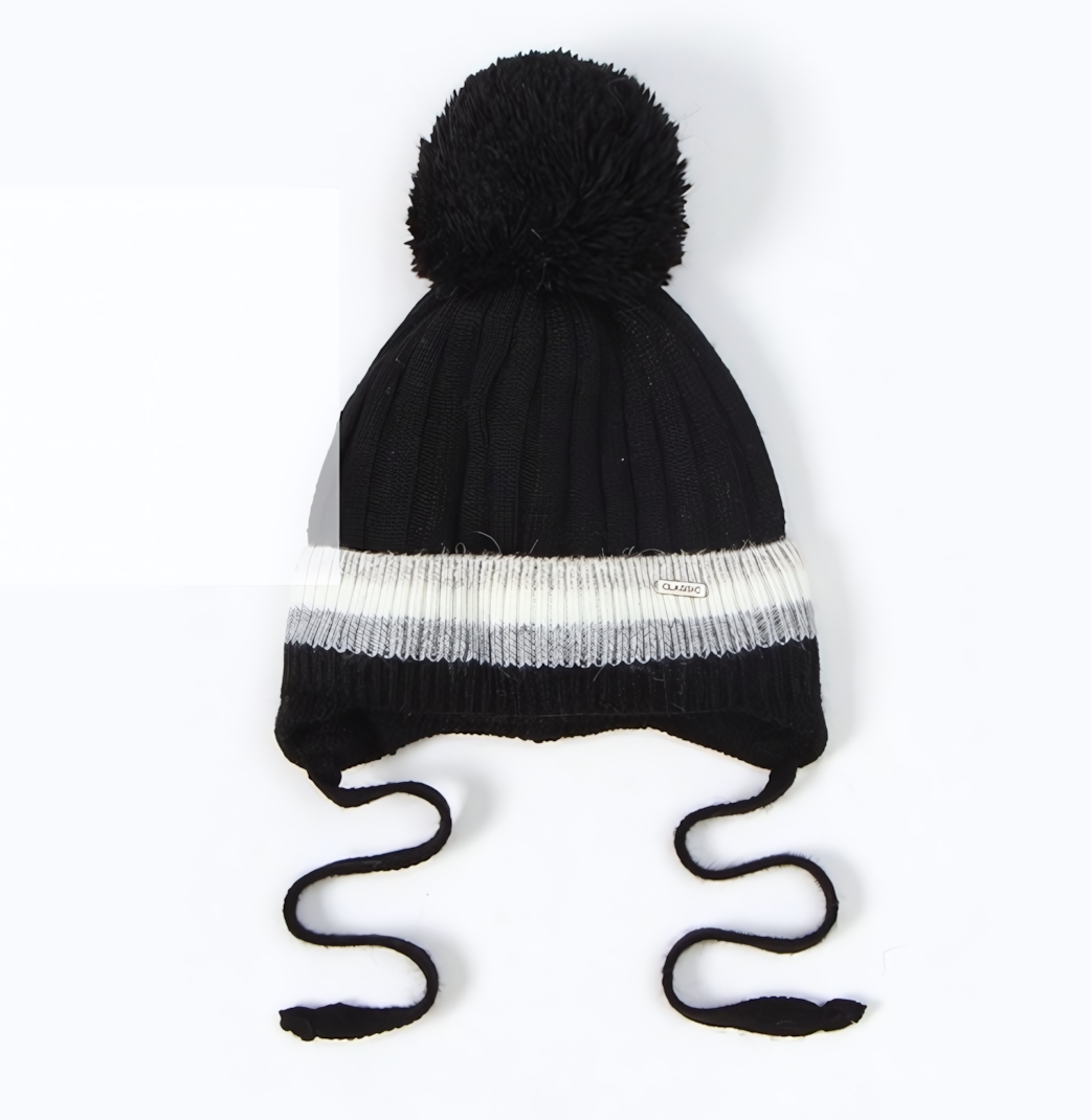 Шапка выполнена с удлиненной формой и ушными клапанами, которые надежно прикрывают уши и защищают от ветра. Завязки в виде закрученных в спираль вязаных шнуров помогают плотно зафиксировать изделие, исключая возможность случайного снятия в активных играх.