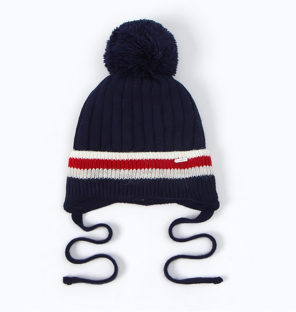 Шапка оснащена мягкими удлинёнными ушками, которые надёжно закрывают уши от ветра, и завязками-шнурами для фиксации положения, чтобы изделие не сползало во время активных игр. Крупный помпон из тёмно-синей пряжи добавляет объём и делает дизайн более выразительным.