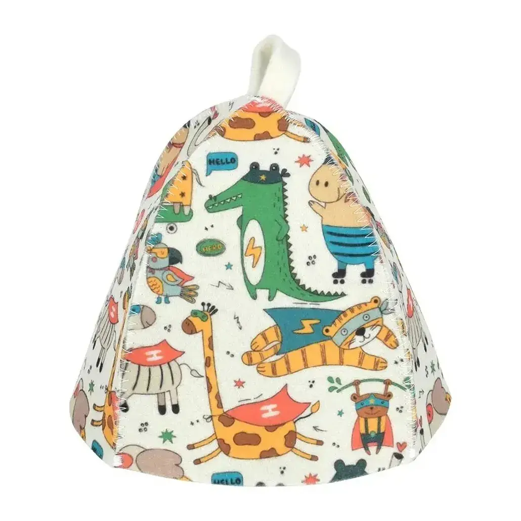 Размер шапки рассчитан на средний детский объём головы. Материал (50% войлок, 50% полиэстер) сочетает прочность и комфорт. Верхняя часть украшена петелькой, которая облегчает процесс надевания. Основной фон белый с красочным принтом в виде животных-супергероев, что делает аксессуар стильным и весёлым дополнением к отдыху в бане.