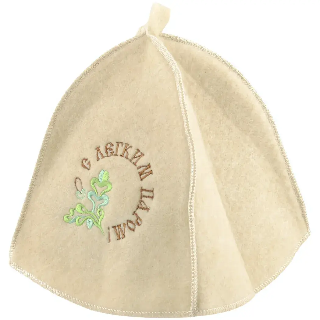 Погрузитесь в атмосферу настоящей русской бани с нашей классической банной шапкой. Она не только защитит вашу голову от перегрева, но и добавит особый уют и комфорт во время парения. Вышивка с фразой «С легким паром!» и растительным мотивом придаёт шапке уникальный стиль и делает её отличным аксессуаром для любителей банных процедур.