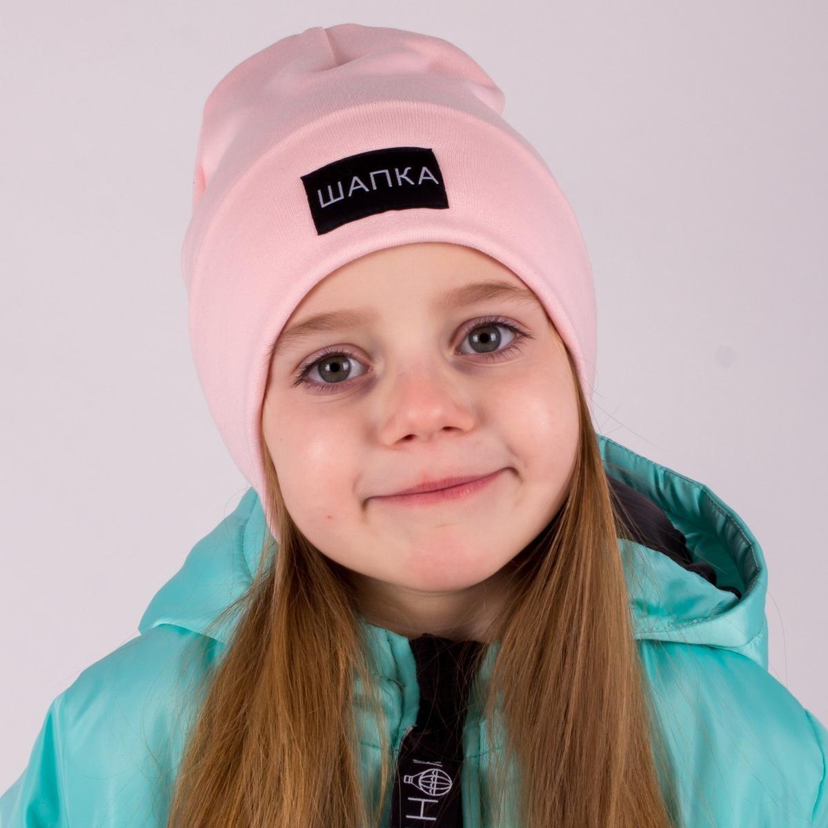 Шапка девочковая хлопковая, пудра, размер 50-54, мягкая, нашивка