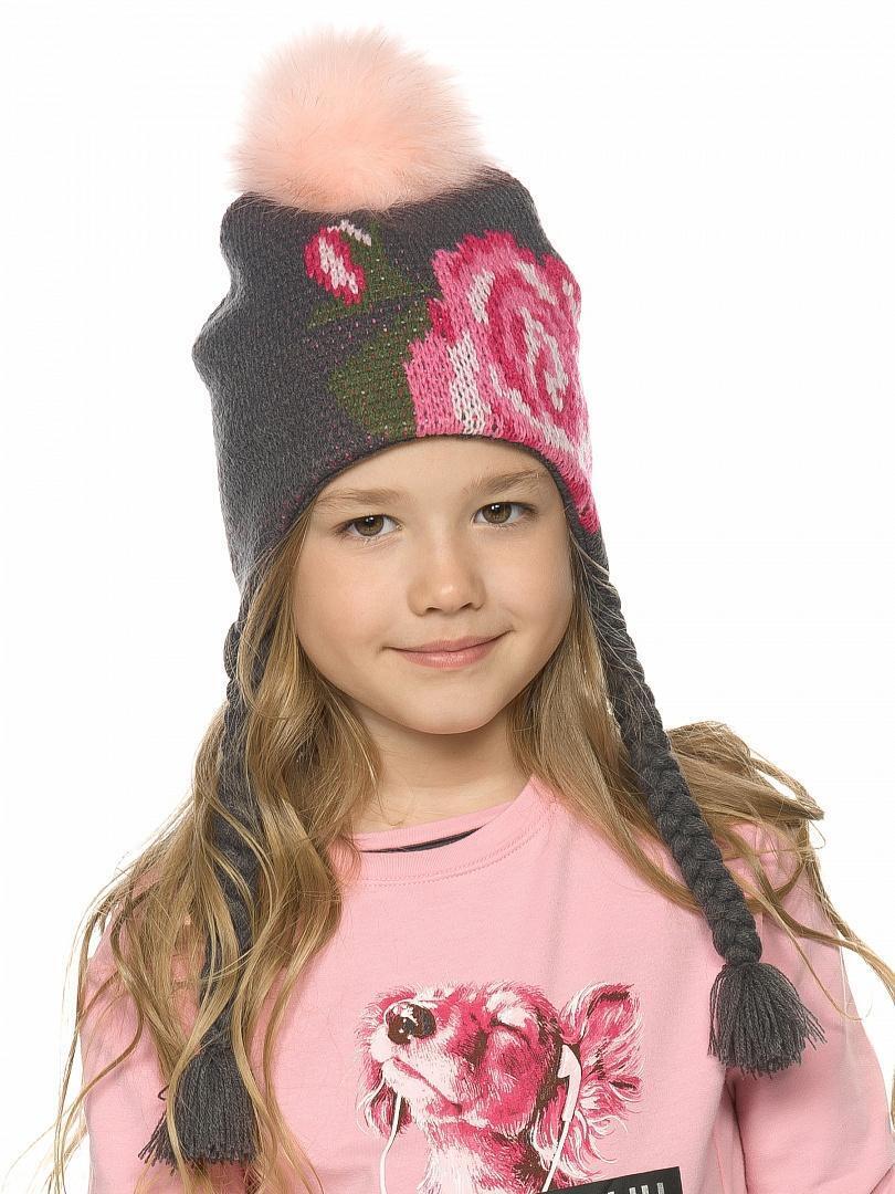 Шапка для девочек с помпоном, размер 50-51, серый/розовый, акрил