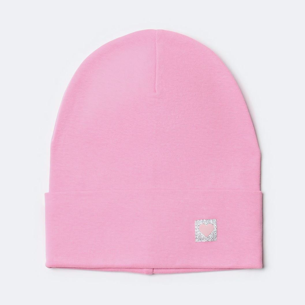 Шапка подходит для демисезонного использования — осенью и весной, когда важно сохранить тепло, но избежать перегрева. Эластичная ткань легко растягивается, позволяя носить изделие детям разного возраста при указанном размере 54. Загнутый нижний край защищает уши от ветра, а декоративный элемент в виде сердца в серебристой рамке делает модель привлекательной для маленьких модниц.